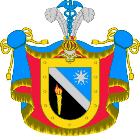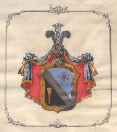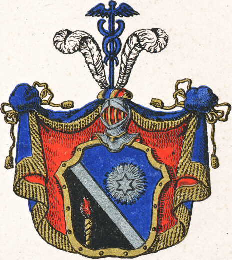 ”… En Swensk Sköld af Guld. På den är Wapnet, som af et hwitt Band snedt öfwer fördelas i Twänne Fält: Det Nedre Fältet swart: deruti et Bergsmans blosz: Det Öfre himmelsblått, och derpå Stella Chemica tindrande i Silfwerfärg. Ofwanom den öpna Torner-hielmen står Mercurii Staf emellan Twänne Struts-fiädrar. Krantsen är wriden af Guld, Blått och Rödt. Wapnetäcket blått, under fordrat med rödt, siradt och bundit med Gyldene Frantsar och Snören.”