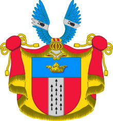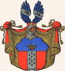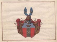 ”… En Klufwen Skjöld, hwaröfwer sees en Blå Chef, som förer en Gyllende Crona. Det Nedra Fäldtet är Klufwit i Trenne lika delar, Hwaraf den Medlersta är en Stolpe af Silfwer, beströdd med Tjo stycken Herminer, Stolpewjs lagde, En och Twå, och så widare. Men den Första och Tredje Delarne äro Röde. Ofwan uppå den Öpne Tornere-Hjelmen sees Twenne Utslagne Blå Wingar, belagde Hwardera med En Bande af Silfwer, och deruppå äfwen Bandevjs en Swart Schröter eller Eichoxe; Hielm Krantsen är af Guld och Rödt, och Wapentäcket till Yttra sidan Rödt och till den Inra af Guld. Aldeles som detsamma Här bredewid med sina rätta och egenteliga Färgor afmålat finnes.”