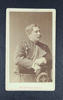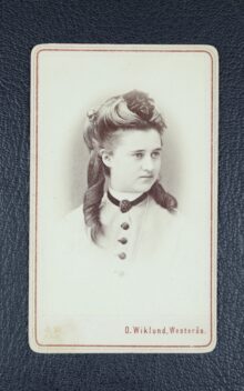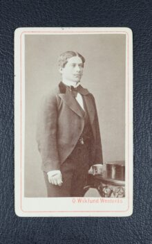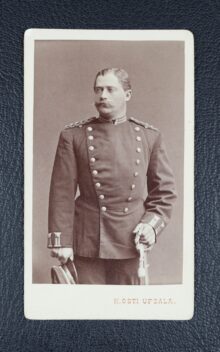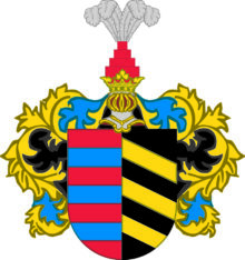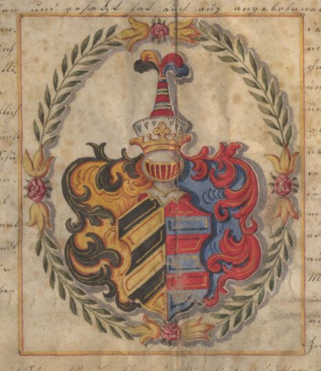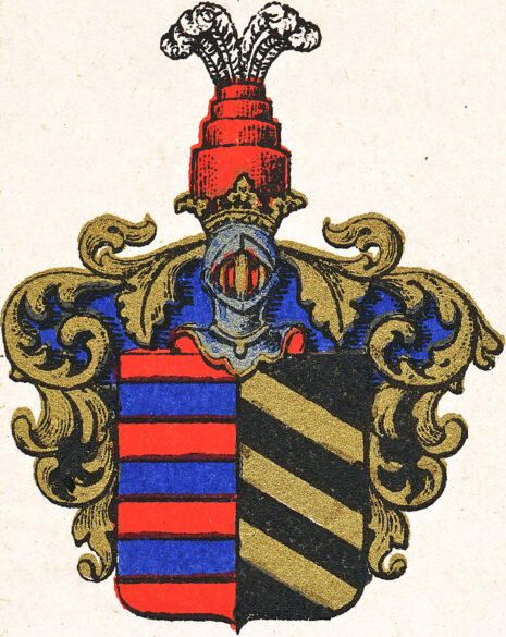 ”… En klufwen Sköld, hwars högra fält är twerskuret sex gånger, eller till sju delar, wexelwis af rödt och blått, utgörande de af sistnämda färg något höjdare bjelkar. Wenstra fältet åter, som är swart, är styckadt genom tre gyllene balkar eller band. Ofwanpå Skölden står en öppen Tornerhjelm, betäckt med krona, hwaruppå ses ett rödt trappstegsformigt, ofwantill twert afskuret, Torn af fyra afsatser eller steg, ur hwilket uppstiga fyra hwita Struszfjädrar, hwaraf twenne äro böjda åt hwar sida, utåt. Skölden omgifwes af Löfwerk, som i dagen är af guld och undertill blått och swart. Alldeles såsom detta Wapen här med sina rätta och egentliga färger afmåladt finnes.”
