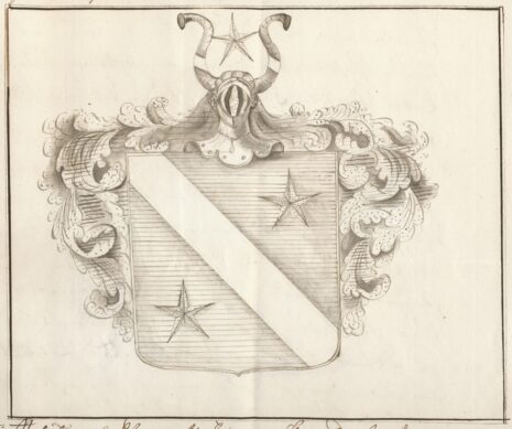 ”… En Blå Skjöld, med en Bande eller Balk af Silfwer, beledsagad af twänne Fem-uddige Stjernor af Guld. På den öpne TornereHjelmen äro twenne Blå Buffel-Horn, hwardera märkt med en Balk af Silfwer och därimellan en Femuddig Stjerna af Guld. Krantsen är wriden af Guld och Blått, och Löfwerket är af Guld och Blått: Aldeles såsom det här med sina rätta och egenteliga Färgor teknadt och afmåladt finnes.”