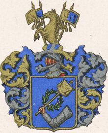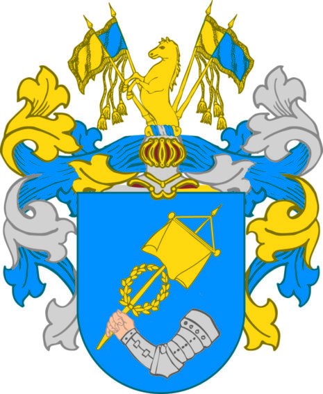 ”… En Blå Skjöld, hwaruti synes en bewäpnad Arm af Silfwer hållandes i handen ett Segerteckn af Guld. Ofvan på Skjölden står en Öppen TornereHjelm, hwarutur upstiger öfwerdelen af en Gyllende Häst, emellan Fyra Estandarer, med blått och Guld om hwarandra fördelte. Krantsen och Löfwärcket är af Guld, Silfwer och Blått. Aldeles som det samma här med sina rätta Färgor afmålat finnes.”