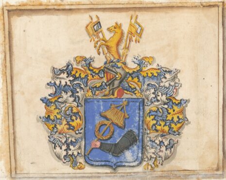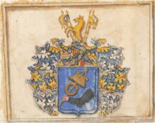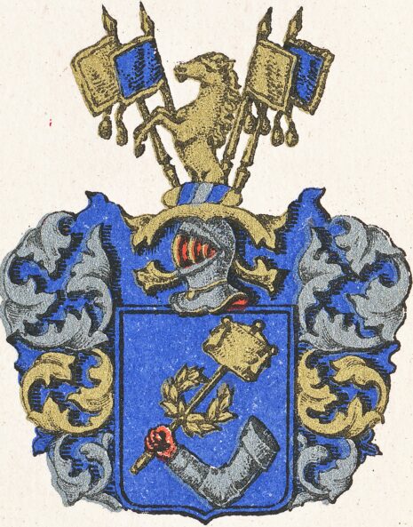 ”… En Blå Skiöld hwaruti är en bewäpnad Arm af Silfwer hållandes ett Segertecken i handen af Guld. Åfwan på Skiölden står en öppen Tornerhielm, hwarutur upstiger öfre dehlen af en Förgylter Häst emellan Fyra Estandaerer med blått och guld om hwar andra fördelte. Crantzen och Löfwärcket är af Guld, Silfwer och Blått. Aldeles som detta Wapen med deβ egentelige färgor här nedanföre afmålat finnes.”