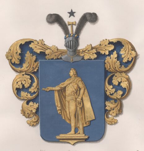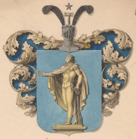 ”… En blå Sköld, i hwilken föreställes Wår Högst Salig Herr-Faders Konung Gustaf III:s i Stockholm upresta Ärestod jämte öfwersta delen af Dess Piedestal, altsammans af Gull. På Skölden står en öppen Tornere-Hjelm, hwarpå hwilar en af blått och Gull wriden Hjelmkrans, från hwilken uppstiga twenne swarta Strutzfjädrar, och emellan dem en Gyllene Marmor-hammar, ofwanföre bestrålad af en femuddig Stjerna af silfver. Hjelmtäcket, eller det så kallade Löfwärket är utantill af Gull och innantill blått. aldeles som det här ofwan med sina rätta och egenteliga färgor afmåladt finnes.”