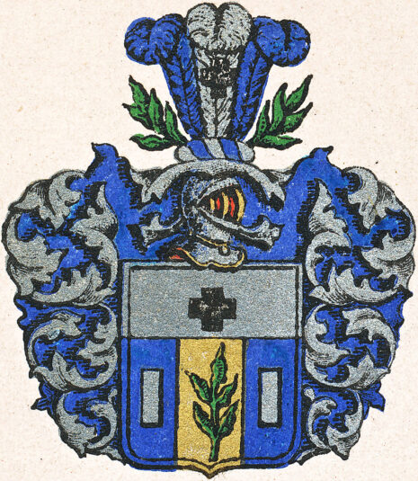 ”… En Blå Skjöld, ofwantill twärdelad med en Chéf af Silfwer, uti hwilcken ligger ett Swart Andeligt Korss. Thet blå Fäldtet ther nedanföre, är klufwet med en Stolpe af Guld, belagd med en grönskande Lager Qwist, prydd med Fem Gröna Blad. Stolpen är följd utaf Twenne Billetter af Silfwer, Stolpewis satte En på hwarthera sidan. Ofwanpå Skjölden är en Öppen Tornerehjelm, uppå hwilcken en Plumage af Trenne Struss Fjädrar är uprest, emellan Twenne grönskande Lager Qwistar, en på hwarthera sidan. Then Medlersta af Struss Fjädrarne är af Silfwer, tecknad mitt uppå med ett Swart Korss, och de begge på sidorna, Blå. Hjelm Krantsen är wriden af Silfwer och Blått, och Löfwärcket af samma Färgor fördelat; Aldeles som det samma här med sina rätta och egenteliga Färgor afmålat finnes.”