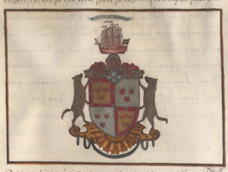 ”… Skjölden oförändrad och sådan som den föres af Skottska Famillen Seton af Touch, neml. Fyrdelad och emot basis spitsad: hwars första Fält är af Guld, omgifwet med en Röd Ram, beströdd med Silfwer Liljor, sådan som den är i Skottska Riks-wapnet: inom Ramen ses tre Röda halfmånar, med upwände Spitsar, twå och en satte. Det andra Fältet är af Silfwer, däruti ses tre Röda fjäll /:Ecussons:/ twå och en stälde. Det tredie Fältet är likt det andra. Samt det fjerde det första. Den öpne Tornerhjelmens Krants är sammanflätad af rödt och guld, samt får nu til Hjelmprydnad et ifrån wänster til höger wändt Skepp, under fulla Segel, med Swensk Handels-Flagg. Öfwerst ses, i en flygande billet, Slägtens Wal-språk: Hazard Zit forward. Löf-wärket, som endast täcker öfra delen af Skjölden, är guld och rödt. Twenne upreste Mårdar af naturlig färg, hålla Wapnet, stödjandes sig altsammans på en decorerad Piedestal: aldeles som det härhos med sina egentel: färgor afmåladt finnes.”