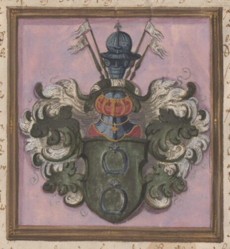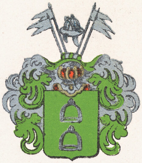 … En grön sköldh, der vthj twenne försilffrade Stegböglar ståendes den ena öffuer den andra, offuan oppå Skölden en öpen Tornerehielm, täckedt och Crantzen medh grönt och hwitt fördeelte offuan opå hielmen en Cachet eller Ryttare Pått, haffuandes twå hwita fahner på hwardhere sijdan, aldeles såsom dhet medh sine egentlige fergor här affmålat står,…..