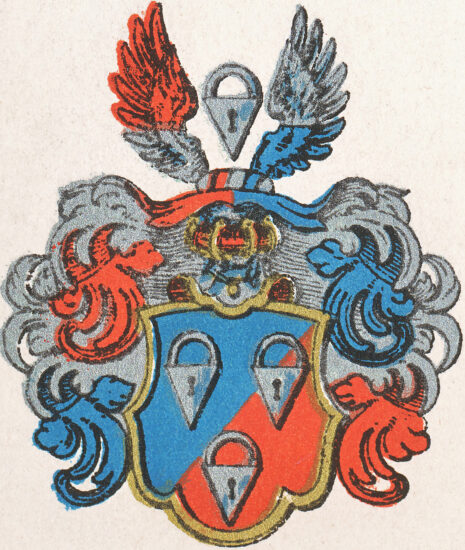 ”… Een fördelt Skiöldh, öfre deelen Blåå, och nedre deelen rödh, däruthi hängiande trij Silfuerlåås, Ofuan på Skölden een öpen Tornerehielm, täcket och Crantzen medh rödt, blått och grått fördeelte, Ofuan opå hielmen ett hängiande Silfuerlåås emellan tuenne Örnewingar af rödh, blåå och gråå färge, aldeles som det medh sine egentlige färgor här hooβ afmåhlat och repræsenterat står.”