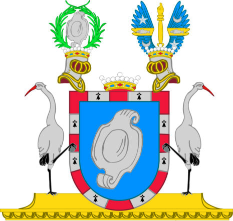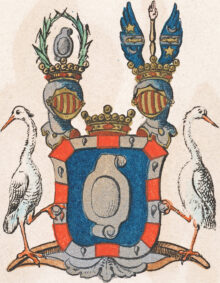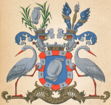 ”… En med ram mgifven blå skjöld, hvaruti förekommer en mindre, med hufvud och fotstycke försedd aflång och bruten skjöld af silfver, varande ramen fördelt i sexton lika dehlar, af hvilka hälften äro silfver, belagde med hvar sin hermine, och de öfrige röde. Ofvan uppå skjölden ses en friherre krona emellan tvenne öpne, med fem byglar försedde och äfven (: här är vapnet inmåladt 🙂 med friherrlige kronor krönte tornerhjelmar. Uppå den högra hjelm kronan står uprest en likadan skjöld af silfver, som i hufvudfältet beskrifven är, omgifven af tvenne grönskande palmqvistar, som i form af en krants ofvantil sammansluta, och utur den vänstra hjelmkronan upräckes emellan tvenne blå vingar en spira af guld, på hvars yttersta ända ses en dommarehand. Vingarne äro belagde hvardera med en guldbjelke och deruppå öfverlagd en silfvergrå fisk, vänd mot höger, varandes bielken på den högra vingen beledsagad af en öfvergående femuddig stjerna af silfver samt undergående en växande halfmåne af samma metall, men på den vänstra vingen omväxlande. Skjöldhållare äro tvenne sig tillbakaseende, naturligt målade vaksamma tranor, som i högra foten föra hvar sin sten, aldeles som thet samma här ofvan med sine rätta och egentelige färgor afmålat finnes. . . .”