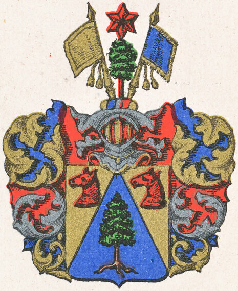 ..En Skiöld genom twenne spitzigt upföre sammangående strek, fördelt i trenne delar, det nedersta Fältet är blått, hwaruti står ett försilfwrat trä, och uti hwardera af de bägge yttra Fälten, som äre af Gull, ses et Hästa hufwud af röd Färg. Ofwan på Skiölden är en öpen Tornerhielm, hwarupå står ett Trä af Silfwer med en röd Molet. Ofwan uppå Toppen emellan twänne Estandarer, hwaraf det högre är af Gull och det wänstre blått. Krantzen och Löfwärcket är af Gull, Silfwer, blått och rödt. Alldeles som detta Wapnet med des rätta Färgor här hos afmålat står….