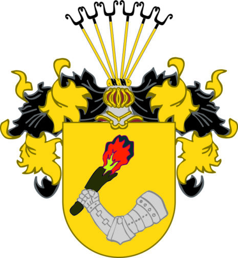 ”… En guul Sköldh, der uthinnan en blåå Harnisk Arm i handen en brinnande Feurbrandh, och en öpen blåå hielm. Crantzen medh guult och Swart fördeelth, äfwen lijka som hielmteket är och ofuan oppå hielmen ähre Sex Vprätte Musquette Gafflar medh Järnfärgor och skafften guula, aldeles som sielfua wapnet här mitt Vppå medh sine egentelige färgor ræpræsenterat och afmålat ståår.”