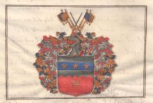 ”. . . En Skiöld i twären fördelt i Twenne delar: warandes det öfra fältet af Silfwer, hwar öfwer sträcker sig en blÃ¥ bielke, pÃ¥ hwilken lysa trenne Stiernor af gull: det nedersta Fältet bestÃ¥r af en röd Crenellerat muhr, mit uppÃ¥ zirad med en molett af gull: ofwan pÃ¥ Siölden stÃ¥r en öpen Tornerhielm, öfwer hwilken synes Twenne kors wijs stälte wärior emellan fyra Estandarer, med gull och blÃ¥t hwar om annan fördelte: Crantzen och Löfwärcket är af gull, Silfwer, blÃ¥t och rödt; Som detta Wapnet med sina rätta och naturliga färgor här hos afmÃ¥lat finnes.”