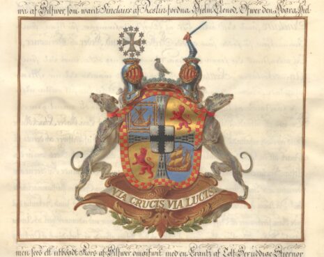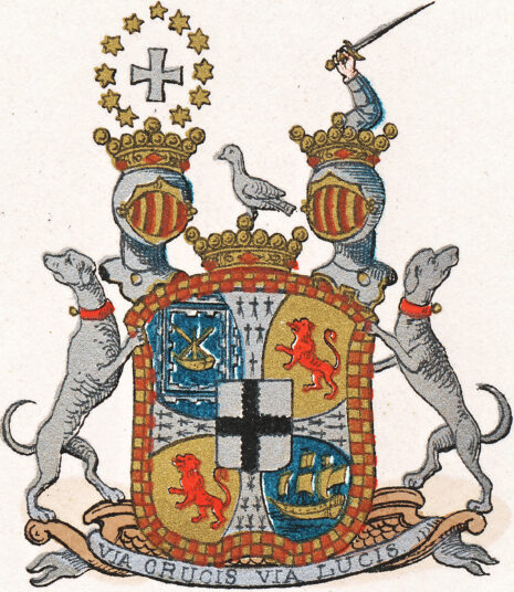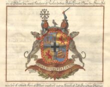 ”… En med ett utbögdt Silfwerkors Fyrdelad, och uti en Ram af Twå Rader Schack-Rutor Guld och Rödt infattad Skjöld, hwar mitt uppå ligger en Hjertskjöld af Silfwer, och deruti ett Swart alt in till Skjöld Kanterne sig strackande inskurit eller Taggigt Kors, som är den äldsta Sinclairska Ättens af Roslin fordna Stam wapen: De följande Fäldterne äro sedermera af de Yngre Brancherne af Freesweeck och Dumbeath, Hwarifrån Öfwersten Härstammar, tillökte, näml: Det Högra öfra Fäldtet är Blått, hwaruti innom en Dubbel med Blomwerck Zirad, Fyrkantig, Gyllende Ram, förekommer ett Skepp liggande för Anckar, wändt emot Höger, med indragne Segel, och Årorne stälde för Masten i Snedkors, altsammans af Guld, och skall Hafwa afseende på Jarladömet af Orckney som Sinclaire af Roslin innehaft. Det andra Öfra Fäldtet till Wänster, och det Tredje eller Nedra Fäldtet till Höger äro lika naml: af Guld, Hwaruti sees ett rödt emot Höger uprest modigt Leyon, som har afseende på Namnet af Spar: Och det Fjerde eller Nedra Fäldtet till Wänster är Blått, som föreställer ett emot Höger för full wind seglande Skepp af Guld, och betecknar Sinclairska Huset af Caithness: Det främst nämde Fyrdelande Korsset af Silfwer, är beströdt hwardera Udden med Sex Herminer 3, 2, 1 ifrån yttra Udden att räkna; Dock att Herminerne på Korsets Bjelcke, å ömse sidor wända sig bielckewis ut emot Uddarne. Ofwan på Skjölden sees emellan Twenne emot Hwarannan wände Öpne och Krönte Tornere Hjelmar, en FriHerrlig Crona, hwarå hwilar en menlös Dufwa af Silfwer, som warit Sinclairs af Roslin fordna Hjelm Clenod. Öfwer den Högra Hielmen sees ett utbögdt Kors af Silfwer, omgifwit med en Crantz af Tolf Sexuddige Stjernor af samma Metall, och warit Branchen af Fresweechs enskildta tillhörighet, och uppå den wanstra Hjelmen sees den Hjelmprydnad, som Öfwerstens Förfäder antagit uppå den Adeliga Hielmen då de här i Riket wunno Naturalisation, och är en upräckt bewäpnad och Stålklädd Arm, förande ett blått dragit Swärd med Fäste af Guld. Skjöldhållare äro Twenne tilbaka seende trogne MjöHundar af Silfwer, med Röda Halsband, och Hitflyttade ur det efter Naturalisationen förde Adeliga Wapnet. Öfwer Piedestalen fladdrar en Hwit Billette med Gyllende Bokstäfwer och Branchens af Fresweechs fordna Wal-språk Via Crucis, Via Lucis. Aldeles som samma Wapn med sina rätta och egenteliga Färgor här frammanföre afmålat finnes.”