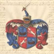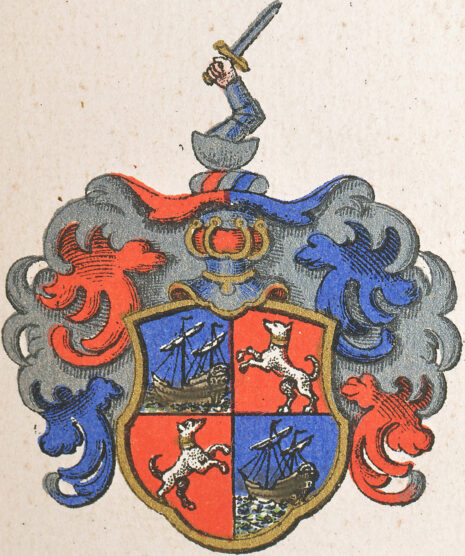 ”… en Uthi 4. deelar fördeelt Skiöldh af rödh och blå ferga, i den nederste deelen på högre sidan står en hwijt Miöhundh uprät medh et rödt bandh om halsen och uthi den öfre deelen Wänstre handen sammaledes en hwijt hundh, Men i det nederste blå feltet på Wänstre sijdan et Skiepp, Så ock i den öfre deelen et Skiepp medh indragne Segell, Uthur en öppen hielm ofwan uppå Skiölden, en bewäpnat Arm medh et bart Swärdh i handen, Löfwärket kring om Skiölden medh himmelsblå, hwijt och rödh färga bemängde, aldeles såsom sielfwa Wapnet härhoos medh sine färger repræsenterat och afmåhlat står, …”