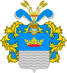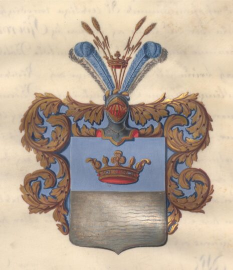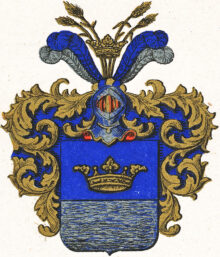 ”… En Fransk Skjöld, tvärdelad till tvänne lika Fält, af hvilka det öfra är blått, och deruti en öppen Gyllene Krona, men det nedra utgöres af en lindrigt wågig Sjö af silfver. På Skjölden hvilar en öppen Torner-hjelm, belagd med en af guld och blått sammanvriden hjelmkrans, utur hvilken upstiga fyra hwete-ax af guld på höga gyllene strån, midtpå omgifne af en gyllene Krona, och lutande tvänne åt hvardera sidan utåt, samt åtföljde å hvardera utsidan af tvänne Strussfjädrar, af hvilka de främre eller närmast hwete-axen, äro blå, men de bägge yttre af silfver. Skjölden omgifves af Löfwerk, som i dagen är af gull, men innantill blått; Aldeles som det med sina rätta och egenteliga Färger här afmåladt finnes.”