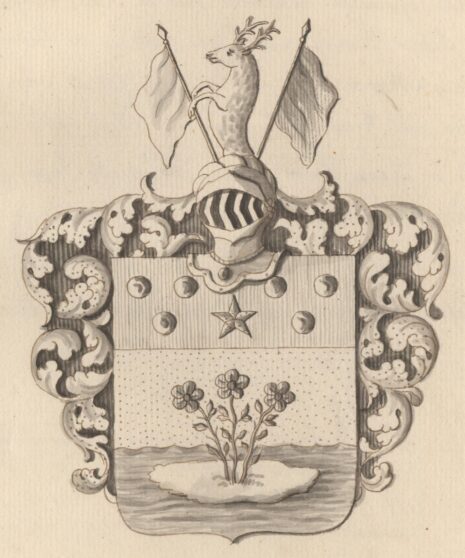 ”… En gyllende Skjöld ofwantill twärdelad med en Röd Chef, hwaruti ses Sex stycken Kulor af Silfwer, 4 och 2 satte, och emellan de Twenne sista Tindrar en gyllende Femuddig Stjerna. Uti det Gyllende Fältet ses uti en Blå Sjö en Holme beprydd med Trenne på Gröna Stjelckar upwäxande Röda Rosor. Uppå Skjölden är en Öppen Tornere Hjelm, och der utur upstiger en half mot Höger wänd Råbock emellan Twenne Fahnor, af hwilcka den Högra är af Silfwer, och den Wänstra Röd. Krantsen är wriden af Rödt Silfwer och Guld, och Löfwärcket är i dagen af Silfwer och Guld, samt i grunden Rödt. Aldeles som det här bredewid med sina rätta Färgor afmålat finnes.”