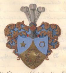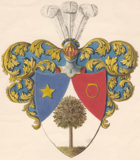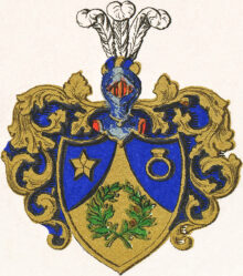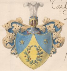 ”… En Engelsk Skjöld, belagd med en af tvänne från midteln af bägge dess sidor dragna inböjda Linier, formerad gyllene Spits, hvari ses en grön Krans, som till dess högra sida är af Orange med blad och mogen frugt, samt å den vänstra af Ek med Löf och Ållon. Bägge SidoFälten äro blå. I det högra tindrar en gyllene femuddig Stjerna, och i det vänstra står en Signetsring af gull. På Skjölden hvilar en öpen Torner-Hjelm, prydd med en af gull och blått sammanvriden hjelm-krans, uti hvilken ses upreste trenne hvita Strussfjädrar. Skjölden omgifves af Löfwerk, som utvändigt är af gull, men innantill blått: Alldeles som detta Wapen med sina rätta och egenteliga Färgor här frammanföre afmåladt finnes.”