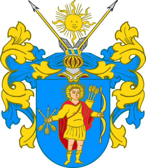 ”… En skiöldh medh blå färga, och deruti en Ung Man, hafwandes i sin höger hand tree pilar, och i den wenstra handen en bogha; widh sijdan en Koger medh pijlar uthi; ofwan på Skölden en öpen Tornerehielm, täcket och Crantzen medh gåhlt och blåt fördelt, och ofwan på hielmen en skijnande Sool, medh en pijl på hwardere sijdan; aldeles som det her hoos medh sine egentlige fergor afmålat står: …”