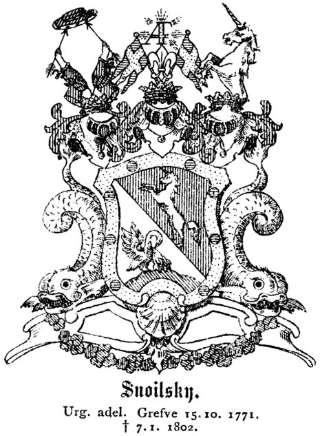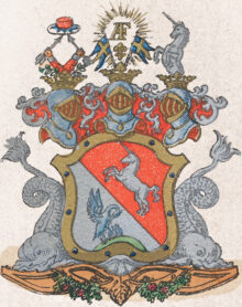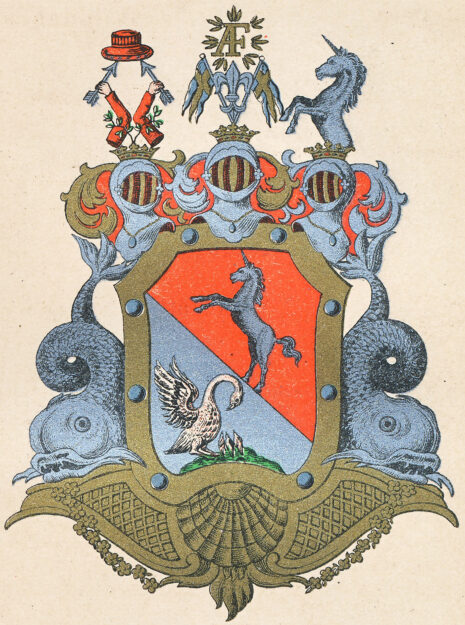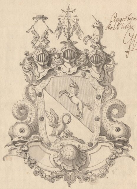 ”… Den fordna Adeliga Stamskölden bibehålles, utan någon tilläggning, allenast att den inneslutes i en Ram af gull, som med Åtta blå kulor är beprydd, Warandes Skölden bandewis styckad i twänne lika delar. I det högra stycket af silfwer, ses en mot wenster wänd grå Pelikan jämte Tre dess ungar, stående på en grön trehuglader Marck och den medlersta hugelen något mera upphöjd. Uti det wänstra stycket, som är rödt, förekommer en Enhörning af silfwer, som med uppräckt Swans, sträcker bandewis i fullt språng emot höger. Åfwanpå Skölden stå trenne öppne med Grefliga Gullkronor krönte och med Sju byglar försedde Tornérhjelmar. Uppå den medlersta hjelmkronan står emellan Två, ifrån hwarannan utlutande kongl: Svenska Kronflaggor med förgyldte Stänger, uppställd en Fransösk Lilja af Silfwer, öfwer hwilken det Glorwyrdigste Kongl: Namnet A. F. uti Chiffre af gull med kringspridde strålar lyser. Uppå den högra hjelmkronan stå uppreste twänne rödklädde Armar med armbogarne emot hwarannan, om hwilke twänne grönskande Lagerqvistar slänga sig, förande hwardera i handen en försilfrad pihl, den ena bande- och den andra barrevis emot hwarannan wände, uppå hwilkas uddar en röd Rådshatt med hermelinsbräm hvilar, Warande armarne för handleden zirade med hwar sin blå bandros: och utur den wenstra hjelmkronan uppspringer half delen af en likadan mot höger wänd Enhörning af silfwer som i Skölden beskrifwen är. Hela Vapnet understödjes af twänne Delfiner af silfwer, som med utwände hufwuden hwila på piedestalen och slänga sin öfriga kropp med treklufne stjertar upp emot hjelmarne. Och sist är ett brutet täcke kring hjelmarne, blandadt med guld, silfwer och rödt; alldeles som det med sina rätta och egentliga färger här afmåladt finnes.”