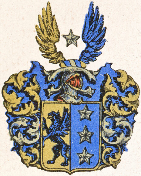 ”. . . Skiölden fördelt i lengden uti tvenne lijka deelar, varandes det högra feltet af guld, och der uti een blÃ¥ grijp, det venstra feltet blÃ¥tt, hvaruti lysa trenne öfver hvarandra stälte stiernor af sölfver. Ã…fvan pÃ¥ skiölden stÃ¥r en öpen tornerhielm, hvaröfver lyser een stierna af sölfver emellan ett par vingar, af hvilka den högra är af guld och den vänstra blÃ¥. Krantzen och löfvercket är af guld, sölfver och blÃ¥tt, aldeles som detta vapnet med dess rätta färgor herhos stÃ¥r afmÃ¥lat. . . .”