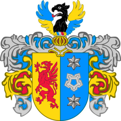 ”… Een Sköld fördelt i längden utj twänne lijka dehlar, det högra Fältet af guld, hwar i wijsar sig en rödh Grijp, det wänstra Fältet är blått, derutj en Skantz af Sölfwer emellan twänne Stiernor af samma metall; Ofwan på Skölden står en öpen Tornerhielm, hwaruthur sträckia sig twänne wingar med gull och blått, hwar om anna fördeelte, emellan hwilka opstijger ett swart Grijpehufwud; Krantzen och Löfwärket är af guld, sölfwer, blått och rödt under hwart annat förblandat, aldeles som sielfwa Wapnet här med sine naturlige färgor afmåhlat finnes.”