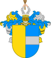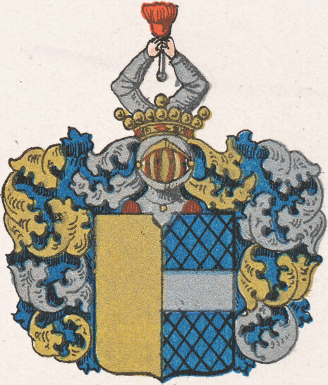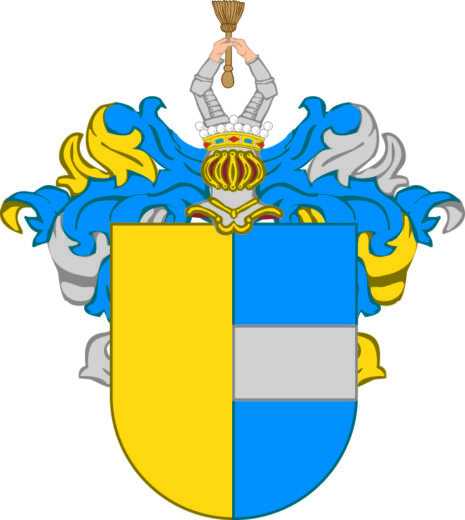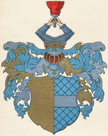 ”… En skiöld fördeld i fyra fält ock mitt uti densamma står det gambla Sope vapnet, hvilket i längden är fördelt i tvänne lika delar, det högra fältet är aff guld ock det vänstra blått, hvaruti ligger en bielke aff sölfver. . . . Utur den högra hielmcronan upstiga tvänne beväpnade armar, hållandes en gyllene qvist emellan händerne. . . . Löfvärcket är guld, blått, silfver och rödt. . . .”