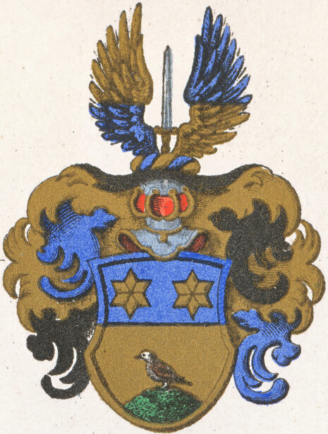 …..En twäran fördeelt Sköldh, deβ öffre deel blåå, och deruthi twenne Stiernor, nederdeelen gåhl, der uthj stående en Sparff medh sin naturliga färga, på ett grönt bergh Offwan oppå Skölden en öpen Tornerehielm, täcket och Crantzen medh gåhlt, blååt och swart fördeelte; Offwan oppå Tornerehielmen, ett oprätt stående bardth Swärdh emellan Twenne wingar, halffwe blåå och halffwe gåhla, aldeeles som det medh sine rätte och egentlige färgor här repræsenterat och affmåhlat ståår…..