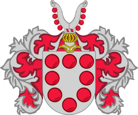 ”… Skölden, hwijth, däruthj Otta röda Kulor, Åfwen oppå Skölden en öppen tornerehielm, täckedh och krantzen medh rött och och hwitt fördeeldte; Åfwen oppå hielmen twenne hwijthe Boffelhoren emillan Otta Kulor, aldeles som thedh medh sine rätte färgor här repræsenteradt och afmåladt finnes.”