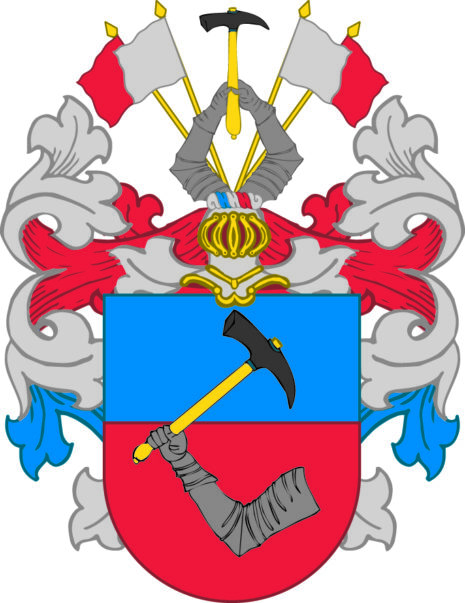 ”… Een fördelt Sköldh, den öfre Halfdehlen blå, och den nedre rödh, uthj Huilken Sköldh ähr en bewäpnat arm som fattar medh Handen en Hammar, Åfwan oppå Skölden en öpen Tornere Hielm, täckedh och Crantzen medh rödt, blått och hwitt fördeelte, Åfwan oppå Hielmen fyra Cornette phanor, deels röde, deels hwithe, och där emellan twänne opprätte bewäpnade armar, fattandes medh Henderne en Hammar, aldeles såsom dedh medh sine egentlige färgor Här repræsenterat och afmålat finnes.”