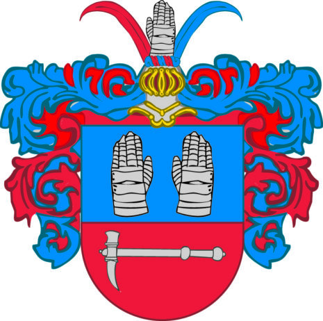 ”… Två försölfrade stålhandsker uti ett blått fiäldh och under handskarne en försölfrad stridshammer tvert öfver uti ett rödt fiäldh, item en öpen tornerehjälm, krantzenn och hjälmtäcket rött och blått. Ther ofvan uppå en försölfrad stålhandske emellan två hanefiädrer, then ene röd, then andre blåå. . . .”
