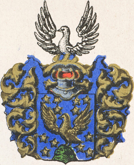 …en blå skiöld, hwaruti en Staare med uthstreckte wingar af gull på en grön Marck med gyllenne Stiernor omkring, ofwan på Skiölden en öpen Tornerehielm, hwaröfwer allenast öfre delen uthaf en Staara af naturel ferg med uthsträckte wingar. Crantzen och löfwärket af guld och blått under hwart annat fördeelt, aldeles som sielfwe Wapnet med sine egentlige färgor afmåhlat finnes…..