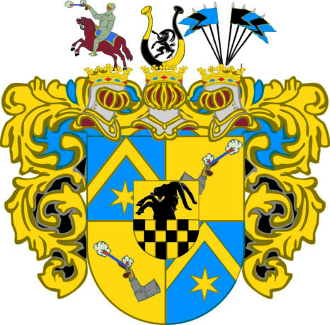 en uppstigande stenbock och kvadrerade detta i första och fjärde fältet med fädernevapnet (sparre över stjärna).