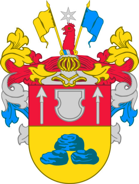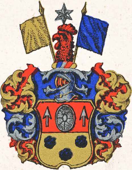 ”… En Skiölld i twärän fördehlt uti twänne lijka dehlar, af hwilcka det öfre Fälltet är Rödt, hwaruti sees en Skiöld af Silfwer, emellan twänne Pijl-uddar af samma metall, och det nedre Fälltet af Gull, hwaruti liggia tre blå Stenar: Ofwan på Skiölden står en öppen Tornerhielm, öfwer hwilken sees en silfwer molett åfwan på ett Hane-hufwud emellan twänne Fanor, hwar af den högra är af gull och den wänstra blå; blifwandes Crantzen och Löfwärcket af gull, silfwer, blått och rödt, aldeles som detta Wapn här afmålat står.”