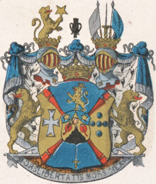 ”… En Skiöld, Twärs fördelt i Fyra Fält, och mitt uppå Fördelningen desz förra Adeliga Stamwapn, som är en Blå Skiöld, med En Guld Spets, fölgd af Twenne gyllende Stiernor, belagd med ett rotadt Swart Berg, hwarutur en röd Eldsflamma utlågar, Berget sidosatt med Twå röda Granat äplen: Men af sielfwa Friherrliga Wapnet är det första Fäldtet Blått, hwarutinnan Ett Gyllende Leijon, med Guld Crona krönt sig upreser: Det Andra Fäldtet är af Guld, med Ett utbögt fritt stäldt hvitt Kors Zirat: Uti det Tredie Guld Fäldtet äro Fem blå Canon-Kulor korszwis lagde; Det Fierde Fäldtet är Blått, hwarutinnan ett Swärd uprest är, Fästet af Guld, Klingan af Silfwer. Ofwan på skiölden stå 2ne Öpne Torner-hielmar, med en Friherrlig Crona emellan, och en på hwardera Hielmen. Ur den Högra Hielm Cronan upstiger Öfwerdelen af Ett Gyllende Leijon, hållandes Uti Högra Ramen En förwänd Guld Stierna. Uppå den Wänstra Hielm-Cronan är Ett Swärd med Guld Fäste och Silfwer Klinga, Uprest emellan Twenne Sammandragne Fahnor, af hwilcka then högra är af Silfwer och then Wänstra blå. Wapnet hålles af Twå Gyllende Leijon, med utåt wände Hufwuden. Aldeles som det samma härhos till alla delar, med sine rätta Färgor afmålat finnes.”