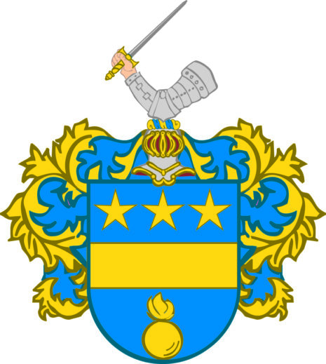 ”… en blå Skiöld, hwari ligger en bielcke af gull, och deröfwer lysa trenne Stiernor af samma Metall, men under bielcken wisar sig en brinnande granat Kula iemwäl af Gull; Ofwan på Skiölden står en öppen Tornerhielm, hwaröfwer är en bewäpnat arm, hållandes ett bahrt Swärd; Krantzen och Löfwärcket är af Gull och Blått, aldeles som sielfwa Wapnet med des egentel: färgor härhoos afmålat utwisar; …”