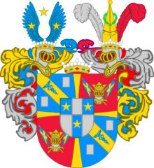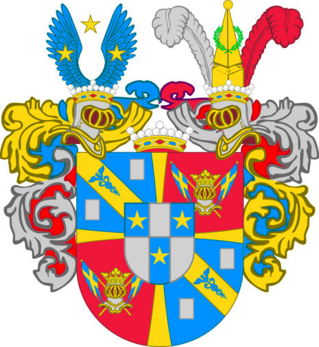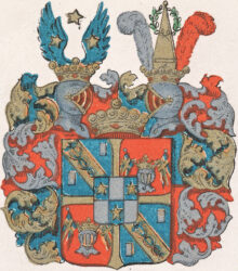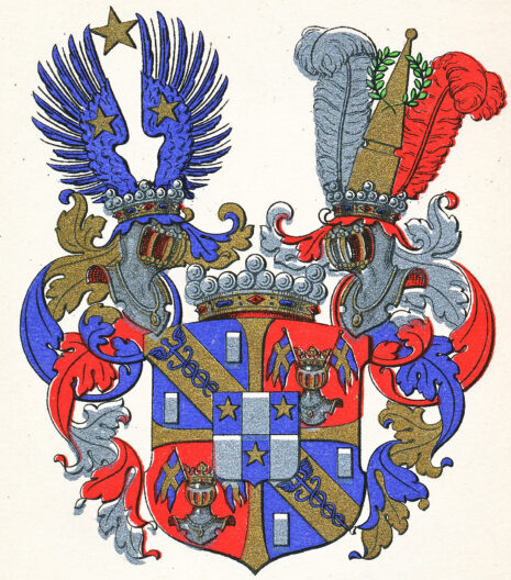 ”… En sköld fördehlt i fyra fält, hvilka med ett gyllende korss ifrån hvarandra skillias, och mitt uppå fördehlningen dess förra adelige stamvapen, som är en sköld, fördehlt genom tvänne streck i längden och ett i tvären uti sex dehlar, lyhsandes uti hvardera af den första, tredje och femte deelen en stiehrna af guld i blått fält. Dhe tree öfrige deelarne äro af silfver, men af sielfva frijherrliga vapnet är det första fältet blått, hvaröfver går en bande af guld emellan tvänne billetter af silfver, varandes sielfva banden zijrad med en blå Mercurii staaf. Det andra fältet är af rödfärg, hvaruti sees en cröhnt försilfrad hielm med tvänne små crohnflaggor igenom. Det tredie fältet är uti allt lijkt med det andra, så ock det fiehrde med det första. Ofvan på skölden stå tvänne öppne tornerhielmar med en frijherrlig crona emellan och en på hvardera hielmen. Öfver den högra hielme-cronan vijsa sig ett paar blå uthsträckte vingar med en stiehrns af guld emellan och en af samma metall på hvardera vingen, men uppå den vänstra står en piramid af guld igenom en gröhn crantz emellan en struss-fiäder af silfver och en af röd färg. Löfvärcket är af guld, silfver, blått och rödt, aldeles som det samma med sine egentelige färgor härhoos afmåhlat finnes. . . .”