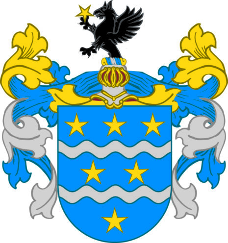 ”… Een blå skiöld hwar uthj 2:ne Twär anstälte Sölfwerfärgade strömmar medh Sex fembuddade stiernor af Gull af hwilka tränne stå öfwerst, twenne medelst, och een Vnderst j skiölden åfwan på skiölden är en öpen Tornere hiellm hwar Vthur Vpstijger öfra deelen af en swart Grijp, hållandes en fembuddat stärna af Gull j högra Rahmen, Crantzen och Lööfwarcket är af Gull, blåt och sölfwer Aldeles som detta Wapnet medh sina Rätta och egenteliga färgor här hoos repræsenterat och afmåhlat ståår.”