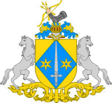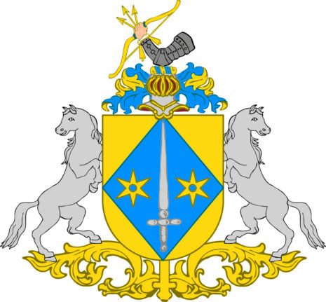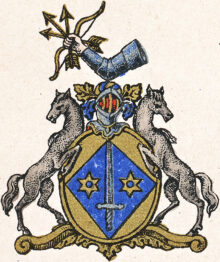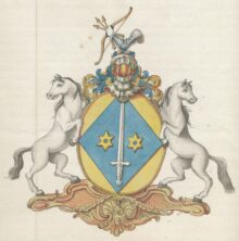 ”… En Skiöld af Guld, hvaruti förekommer en blå Ruta, som sträcker sig in till alla Fyra Skiöldkanterne, belagd med ett Spetsen upwänd och uprätt stående blottat Twehändigt Svärd af Silfver, beledsagat med Twenne Moletter af Guld. Ofvan på Skiölden är en Öppen Tornere Hjelm, hvaruppå sees en mot höger wänd Bewäpnad Wenster Arm, som i handen förer en Flitzbåge af Guld, ålagd med Tre Pilar af samma Metall. Hielm Krantzen är wriden af Guld och Blått. Skiöldhållare äro Twenne Grå med utwände hufwuden sig tillbaka seende modige Hästar. Aldeles som det sama här med sina rätta och egendtliga Färgor afmålat finnes.”