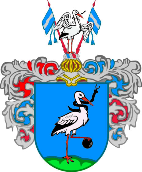 ”… En Blå Sköldh, der Vthj en Storck stående på ett grönt fält, hållandes en Orm j munnen, och fattandes medh den ena foten ett Lodh. Ofwan opå Skölden en Öpen Tornerehielm, Crantzen och hiälm täcket medh hwitt, rödt och blått fördeelt; På hiälmen en Stårck medh florande Wingar, hållandes j munnen en Orm och ståendes emillan Twenne Cornett medh Blått och hwitt fördelte; Aldeles, som sielfwe Wapnet här mitt opå, medh sine egäntlige färgor reprasenteradt står: …”