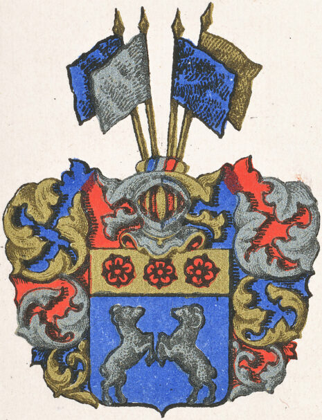 ”. . . Skiölden fördeelt i twäran utj Twenne deelar, den öfra deelen är een chef af Gull, hwarutj wijsa sig Trenne röda Roosor, det nedra Fältet är blÃ¥tt, hwarutj stÃ¥ Twenne emoth hwarandre opreeste Gumsar af Sölfwer, ofwan pÃ¥ Skiölden stÃ¥r een öppen Torrnerhielm, hwaruthur opstijga Fyra Fahnor med Gull, Sölfwer och blÃ¥tt, hwar om annan fördeelte, Crantzen och Löfwärket är af Gull, Sölfwer, blÃ¥tt och rödt, aldeles som detta Wapnet med des rätte och egentelige färgor, här hoos stÃ¥r repræsenterat och afmÃ¥hlat.”