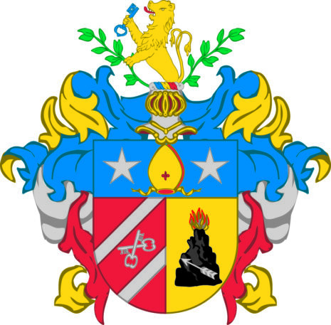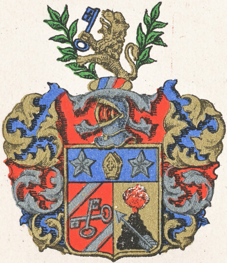 ”… En Skiöld i längden fördelt i twenne lika delar, warandes det högre Fältet rödt, med twenne korswis stälte försilfrade Nycklar uti, emellan twenne barrer af silfwer, det wänstra Fältet är af Gull, hwaruti wisar sig ett swartaktigt brinnande Berg, wid hwars roth är en bande-wis stäld Pihl af silfwer; Öfwerst i Skiölden är en blå Chef zirat med en gyllende Biskops mysza emillan twenne Stiernor af Silfwer: Ofwan på Skiölden står en öppen Tornerhielm, hwarutur upstiger öfre delen af ett förgylt Leijon, emillan twänne gröna Lagerqwistar, hållandes Leijonet en blå Nyckel med högra ramen; Crantzen och Löfwärcket är af Gull, Silfwer, blått och rödt, aldeles som detta Wapnet här afmålat står.”