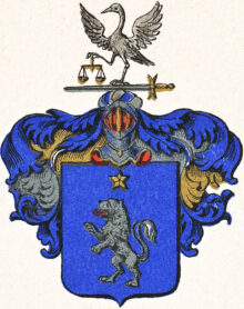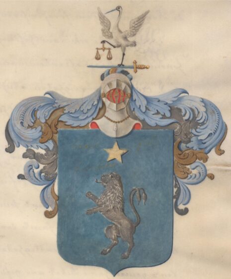 ”. . . En blå Skjöld, hwaruti ses ett på bakfötterne upprest, till höger wändt Lejon af silfwer med uträckt tunga och klufwen Swants. Öfwer Lejonet swäfwar en gyllende, femuddig, med ena spitsen uppåt stäld Stjerna. På Skjölden hwilar en öppen Tornerhjelm, betäckt med en af guld, silfwer och blått sammanwriden Hjelmkrants, på hwilken står en till höger wänd Trana af naturlig färg, med utslagna wingar och hållande i högra foten en jämnt hängande wåg med balance och wigtskålar af guld, samt under wänstra foten ett bjelkewis liggande, med spitsen åt höger wändt dragit Swärd, klingan af stål, men fästet af guld. Löfwerket är i dagen blått, men innantill wäxelwis af guld och silfwer; Aldeles som det med sina rätta och egenteliga färgor här afmåladt finnes.”