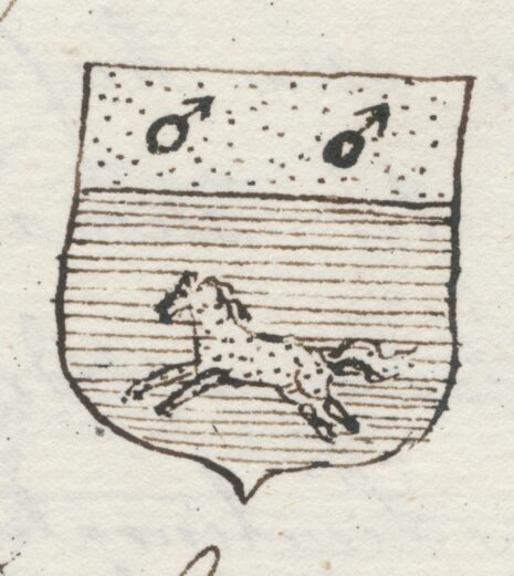 ” En Fransk Sköld, twärdelad med en gyllene Chef, hwaruti ses twänne i bredd ställda Martis eller jernets tecken af mörk färg. I nedra Fältet, som är blÃ¥tt, löper en betslad gyllene Häst i fullt fyrsprÃ¥ng Ã¥t höger; PÃ¥ Skölden hwilar en öppen Tornerhjelm, belagd med en af guld och blÃ¥tt sammanwriden Hjelmkrans, hwarutur till hälften upreser sig en vingad Ã¥t höger wänd gyllene Häst med bakÃ¥t slagna wingar; Skölden omgifwes af Löfwerk, som utwändigt är af guld. Aldeles sÃ¥som detta Wapen här ofwan med sina rätta och egenteliga färgor afmÃ¥ladt finnes. …”
