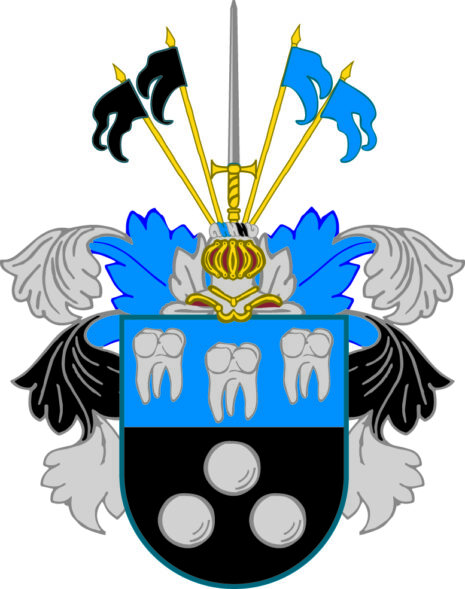 ”… En fördeelt Sköld, Öfwerdeelen Blåå, der i Tree Tänder; Vnderdeelen ähr Swart och der i Treenne Kuulor; Ofwen på Skiölden een Öpen Tornerehielm, Crantzen och Hielmtäcke Swat, Hwith och blåt fördeelt, der opå ett bart Swerdh medh förgyld fäste Stående emellen Twenne Swarte och twenne Blåå Standarer alldeles som Sielffwe Wapnet, her mitt opå med sine egenteliga färgor repraesenterar, …”