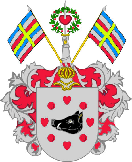 ”… till förbettring på för(bemel)de: hans skiöld och skiölde mercke, fyre rödhe bysse lodh, och fyre rödhe hiertte kring om för.ne: Swine huffuud, Item En öpen tornere hielm, krantzen och hielm tecket rödt och hwiitt, ther offuan opå Twå knechte fenicker, medh hwiitt, rödh och blå ferger, och dher vdhi Ett guult kors, och ther emillan En halff wäpnet arm medh Ett swerd genom Ett rödt hierte, och En näglike krantz kring om hiertet, …”
