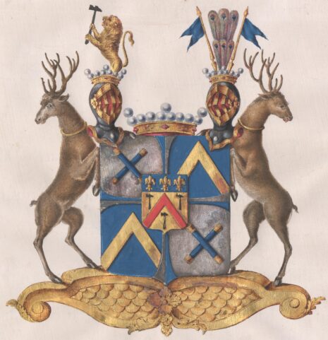 ”. . . En Sköld, klufwen och delad till fyra fält genom ett wid ändarna utböjdt kors, som wexelwis af blått och silfwer, är så fördeladt, att det mot högra öfra och nedra wenstra fälten är blått, men mot de andra twenne fälten af silfwer. Korset är midtpå belagdt med en Hjertsköld, innehållande Ättens adliga Wapen, nemligen: en Sköld, twerdelad af en blå ginstam, hwari ses trenne i bredd ställda gyllene Franska Liljor, och nedra delen, som är af guld, fördelad genom en röd Sparre i trenne delar, hwardera innefattande en swart upprättstående till höger wänd Hammare. Högra öfra och nedra wenstra fälten af Friherrliga Skölden äro af silfwer, och i hwardera ses twenne i kors lagda blå Commando-stafwar med knapp och dobbsko af guld. I öfra wenstra och nedra högra fälten, som äro blå, står en gyllene Sparre. På skölden hwilar en Friherre-krona emellan twenne med dylika krönta öppna Tornerhjelmar. Utur den högra uppstiger till hälften ett åt höger wändt gyllene Lejon, hållande i ramarna en swart Hammare. Uppå den wenstra åter stå sex Påfågel-fjädrar, tre och tre öfwer hwarandra, emellan twenne, åt hwar sin sida utåt fläktande, i ändarna klufna, blå Standarer med gyllene stänger. Skölden stödes af twenne uppreste Kronhjortar, om halsen prydde med en gyllene ring och stående med bakfötterna på en fotställning af guld; Alldeles såsom Wapnet här ofwan med sina rätta och egentliga färger afmåladt finnes.”