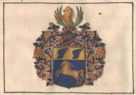 ”… en blå Skiöld, hwari wisar sig en springande Häst med betzel af Gull, och deröfwer en Chef iemwäl af Gull, zirat med ett par blå Wingar; Ofwan på Skiölden står en öppen Tornerhielm hwarutur upspringer öfre dehlen af en äfwen slijk Häst som i sielfwa Skiölden emellan twenne gröna Palmqwistar; Krantzen och Löfwärcket är af gull och blått, aldeles som detta Wapen med des egentel:a Färgor här brede wid afmålat finnes.”