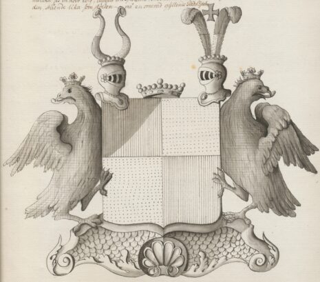 ”… En fyrdelad skiöld, uti hvilken det första och fjerde fäldtet är rödt samt det andra och tredie af guld. Uppå skölden sees tvenne med friherre cronor täkte öpne tornerehjelmar och emellan dem på sjelfva skiölden hvilar en större friherre crona. Uppå den högra hjelmen äre tvänne utvände buffelhorn, skiftevis emot hvarannan afdelade med guld och rödt, och uppå den vänstra tvänne på lika sätt med guld och rödt fördelade strussfjädrar, emellan hvilka ses ett rödt kors, utböjdt vid spikarne. Sköldhållare äro 2:ne naturligt målade svarta örnar med utvände hufvuden, stående lika som skölden på en ornerad gyllende pied d’estal. Aldeles som detsamma här med sine egenteliga färgor afmåladt finnes. . . .”