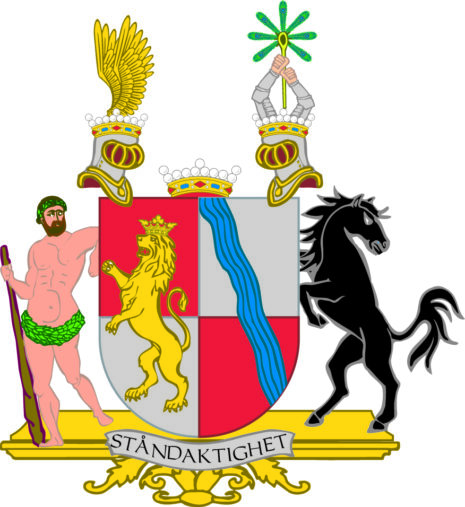 ”… En Klufven och delad Sköld, i hvars högra hälft, som består af tvänne fält, det öfra rödt och det nedra af silfver, visar sig et på bakföttren uprest samt till höger gående Krönt Leijon af guld. Snedt öfver den venstra hälften af Skölden, som äfvenväl har tvenne fält, men det öfra af silfver och det nedra rödt, löper bandevis en blå ström. Midt ofvan uppå Skölden står en Friherrlig Krona, emellan tvänne med gyllene böglar försedde Tornere-hjelmar, hvardera jemväl med dylik Krona betäckt. Utur den till höger ställda upstiga tvänne med fjädrarne åt vänster vända gyllene vingar; och utur den vänstra Hjelmkronan upsträckas tvänne stålklädda armar, som tillsammans uprätt öfver sig hålla en i mitteln blå, men rundt derom kring af sju glänsande påfågel-fjädrar sammansatt solskärm. Skölden uppehålles till höger af en naken villd man, försedd med Krans af grönskande löf omkring hufvudet och lifvet, och förande i högra handen en nedvänd Klubba; Till venster af en uprest, sig tillbaka seende svart häst. Piedestalen, hvarpå dessa Sköldhållare hvila, är nedanom Skölden behängd med et band af silfver, på hvilket tecknat finnes Ättens valspråk: Ståndaktighet; Aldeles såsom detta vapen med sina rätta och egenteliga färgor här afmåladt finnes.”