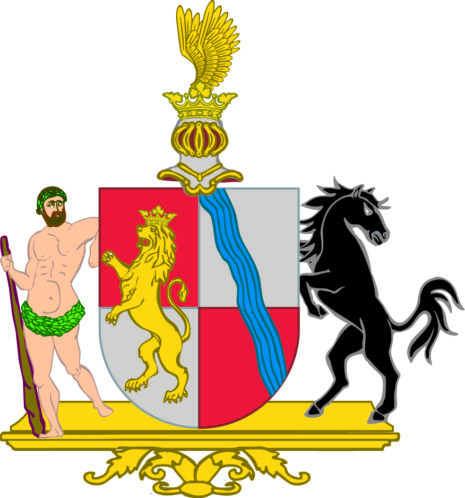 ”… En Klufven Skjöld, högra Fältet af Skjölden mitt uppå tvären Fördelt, ofwantill Rödt och nedantill af Silfver, uti hvilka Fält mitt öfver Delningen ses ett till höger gående Gyllene Krönt Leijon, Wänstra Skjöldens Fält likaledes tvärdelt, ofvantill af Silfwer och nedantill Rödt: Öfver hvilka bägge Fält rinner en Blå Ström Bandevis; Uppå Skjölden är en öppen med Tysk Adelig Krona krönt Tornerhjelm; Utur den Samma upreser sig Tvänne ihopasatte Vingar af Guld, vändande sig bägge till vänster. Skjölden uppehålles till höger af en Naturlig med Ekelöfs Hufvudbonad och LifGjördel försedd Wildman, Stödjande Sig på sin Klubba, och till Wänster af en Svart modig Häst, bägge stående, liksom Skjölden; på en gyllene decorerad Pied d’Estal, aldeles som det samma här frammanföre, med sine rätta färgor afmålat finnes.”