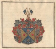 ”… En Skiöld genom en tranché- och taillé-strek fördelt i fyra deelar; warandes det öfwersta Fältet blott, med en försilfrad hielm uti; det nedersta är äfwen af blå färg, hwaruti sees en sölfwer molett; men de begge yttre Fälten äro af guld, hwardera Zijrade med en röd kula. Ofwan på Skiölden står en öpen Tornerhielm, på hwilcken wisa sig twenne i korszwijs stälte lantzar af gull, emellan twenne blå estandarer. Crantzen och löfwärcket är af guld, Sölfwer, blott och rödt; aldeles som detta Wapn med deβ egentelige färgor härhoos afmåhlat finnes.”